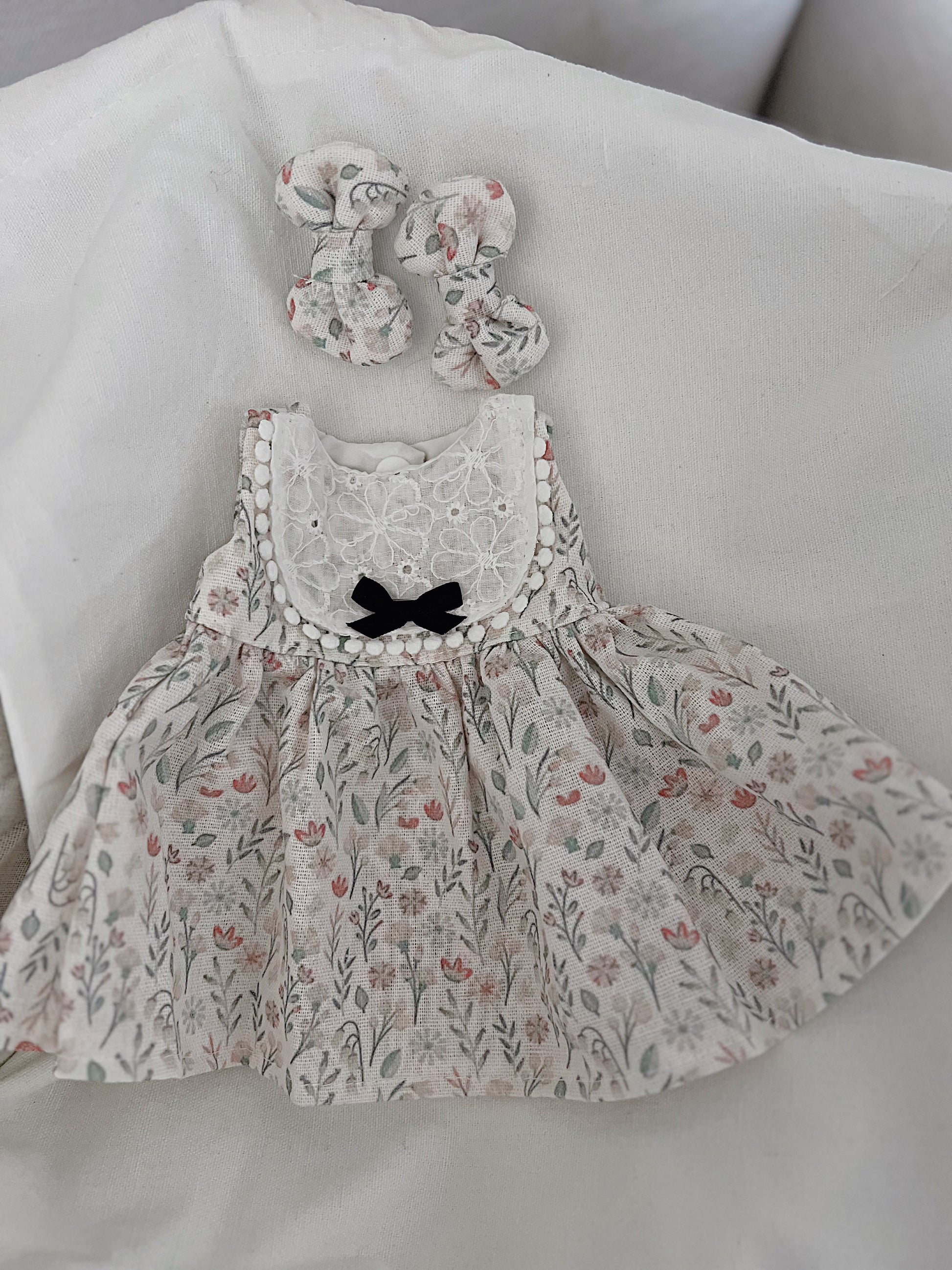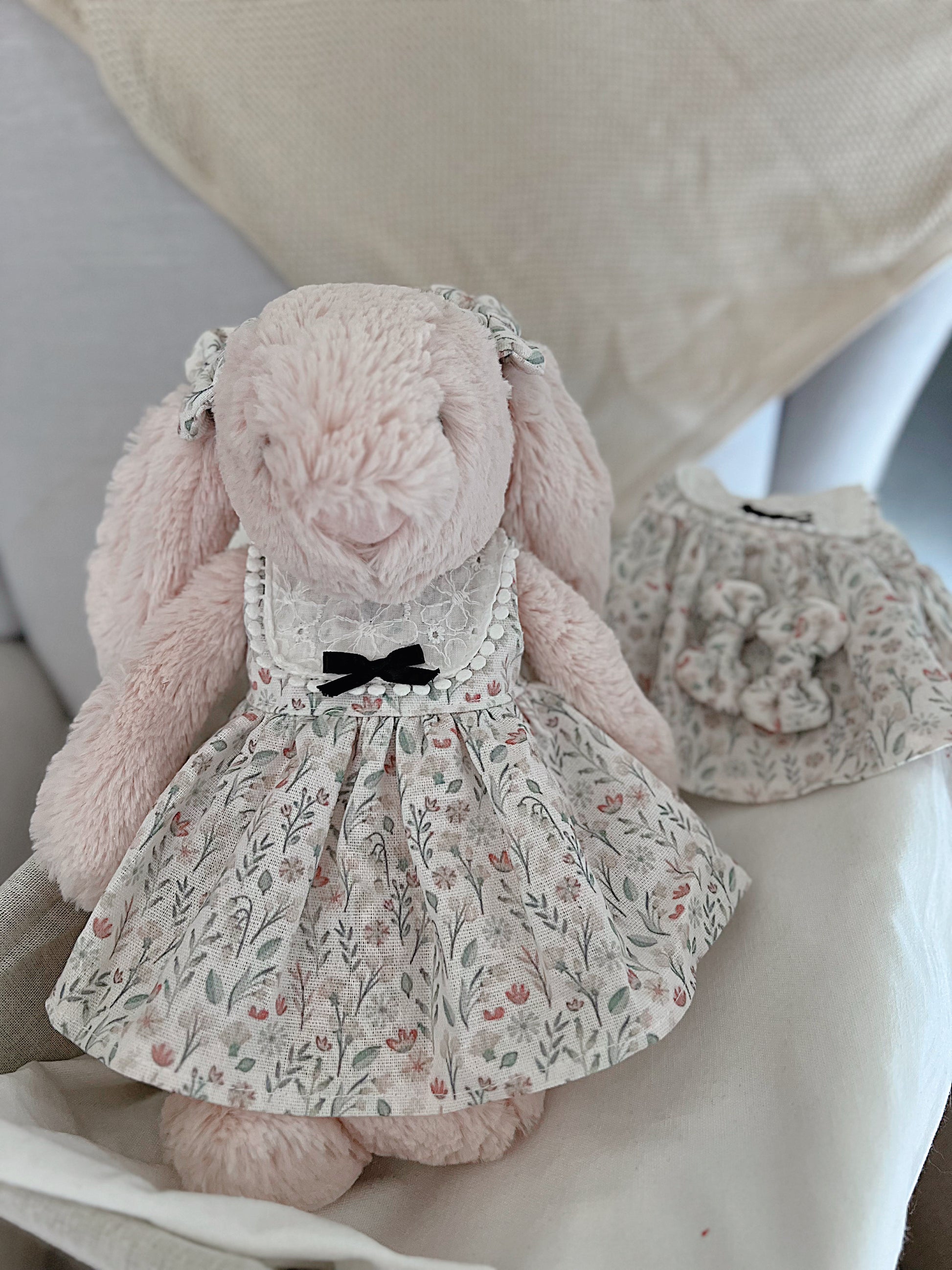 Delicate, timeless, and oh-so-sweet — The Meadow Bloom Dress Set is perfect for dressing up your Jellycat bunny (size Medium or similar). Featuring a vintage-inspired floral print with soft pinks and greens, this set includes a beautifully pleated dress with intricate lace detail and a charming black bow. Complete the look with the matching hair clips for an extra touch of whimsy.